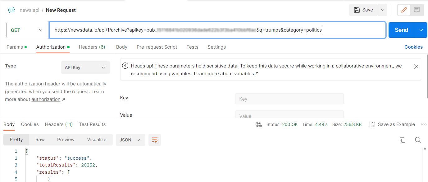 Just like other NewsData.io API requests, include your API key for authentication.